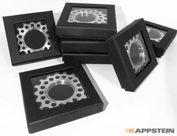 Made in Germany. Das „Sprocket“ von Kappstein wurde entwickelt um eine neue Design Theorie zu verwirklichen. Aufgrund dieses neuen Designs ergeben sich zahlreiche Vorteile. Man kann deutlich erkennen, dass die Zähne etwas breiter und länglicher anmuten, dies sind jedoch nicht die einzigen Neuerungen. Kappstein verwendet für die Herstellung dieser Hochleistungsritzel nur besten Edelstahl. Dieser wird in CNC Fräsen, der neuesten Generation, verarbeitet. Die neue Design Theorie wirkt sich sehr materialschonend auf alle Komponenten aus. Zudem ist es gelungen, eine bessere Kraftübertragung auf die Straße zu bringen. Durch die eingefassten Löcher ist das Ritzel außerdem auch sehr leicht geworden. Bei 16 Zähnen wiegt es gerade 49 Gramm.